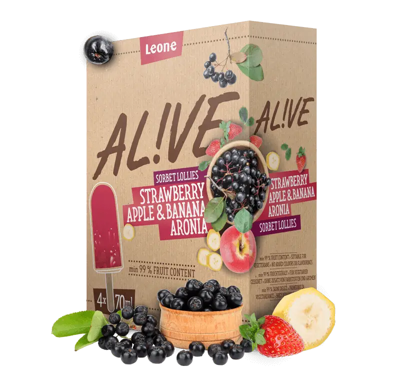 Sestavine: jagodna kaša (43 %), jabolčni sok iz zgoščenega soka (29 %), zgoščeni jabolčni sok (12 %), bananina kaša (10 %), sok aronije iz zgoščenega soka (5 %), stabilizator: gumi iz zrn rožičevca.