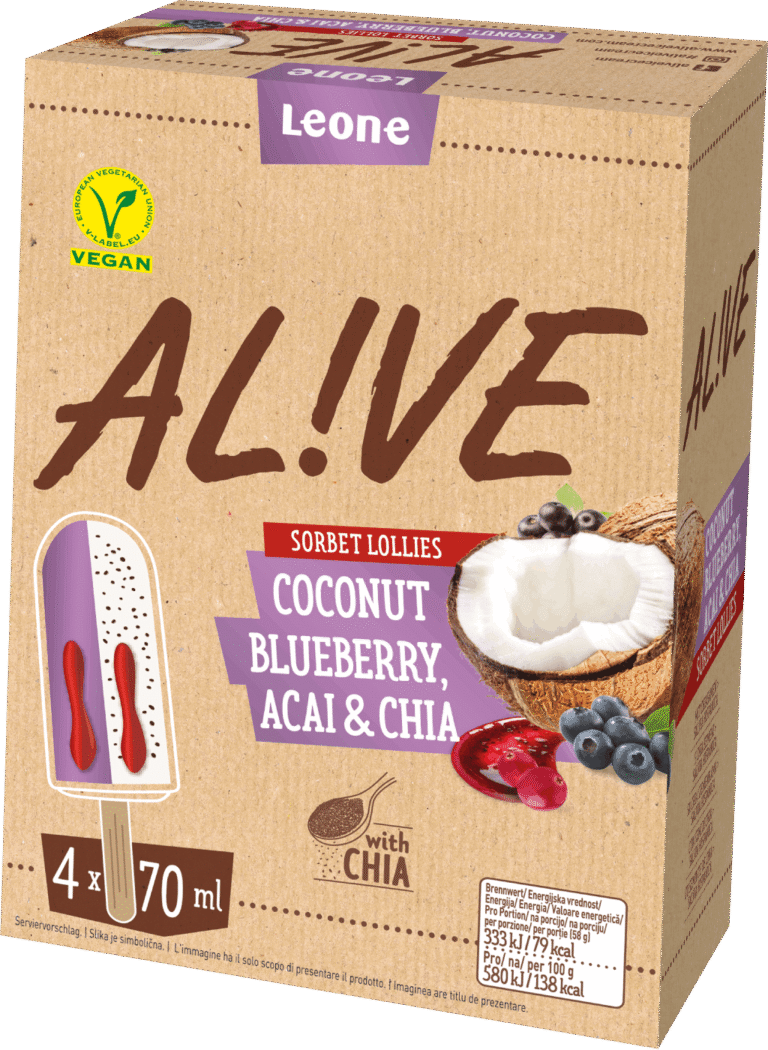 ZAMRZNJEN KOKOSOV DESERT Z GROZDNIM SOKOM IN CHIA SEMENI (SALVIA HISPANICA) (44,9 %), ZAMRZNJEN DESERT Z BOROVNICAMI IN S SOKOM IZ ACAI JAGOD (44,8 %), POLNJENO Z BRUSNIČNIM PRELIVOM (10,3 %).