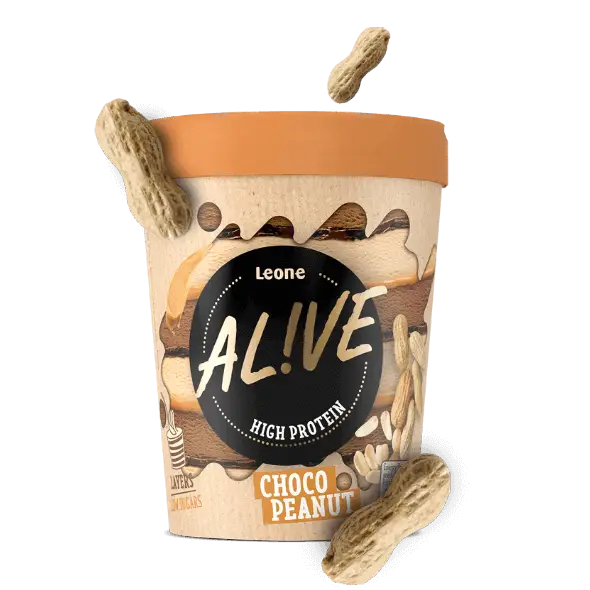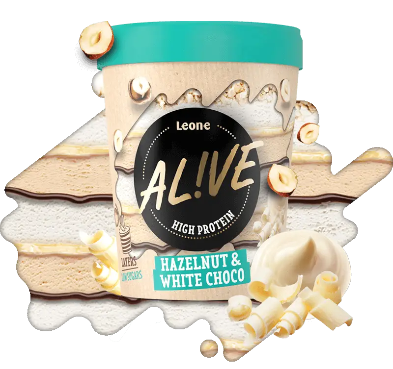 Sladoled z okusom mleka z visoko vsebnostjo beljakovin in sladoled z okusom lešnika z visoko vsebnostjo beljakovin, z belo čokolado, z lešnikovim in kakavovim krem namazom in koščki praženih lešnikov.