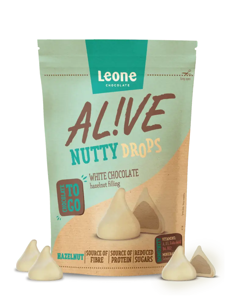 Belo čokoladne kapljice polnjene s lešnikovim polnilom. Z dodanimi mlečnimi beljakovinami, vitamini in minerali. Vir prehranske vlaknine. Vir beljakovin. Vir vitamina A, D, B6, folne kisline, B12, cinka in selena. Zmanjšana vsebnost sladkorja.