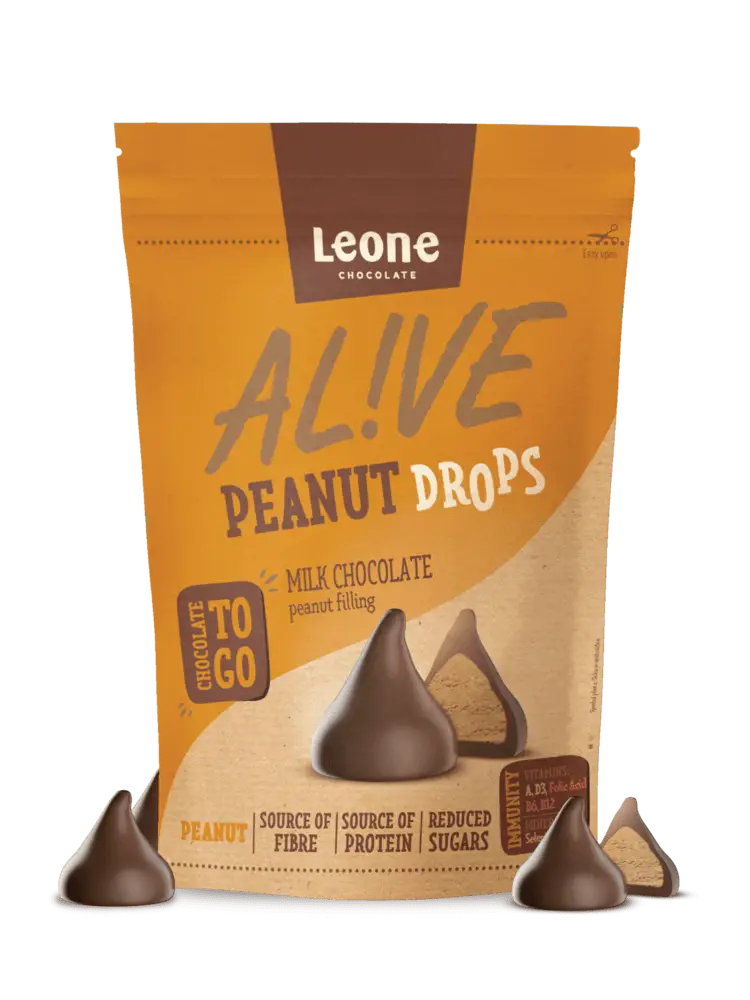 Zmanjšana vsebnost sladkorjev. 30 % zmanjšana vsebnost sladkorjev v primerjavi s podobnimi izdelki drugih blagovnih znamk. Z eno porcijo AL!VE Peanut drops z dodanimi vitamini in mineraloma (32 g) pokrijemo 15 % dnevnih potreb po izbranih hranilih. Raznolika in uravnotežena prehrana ter zdrav način življenja sta pomembna.