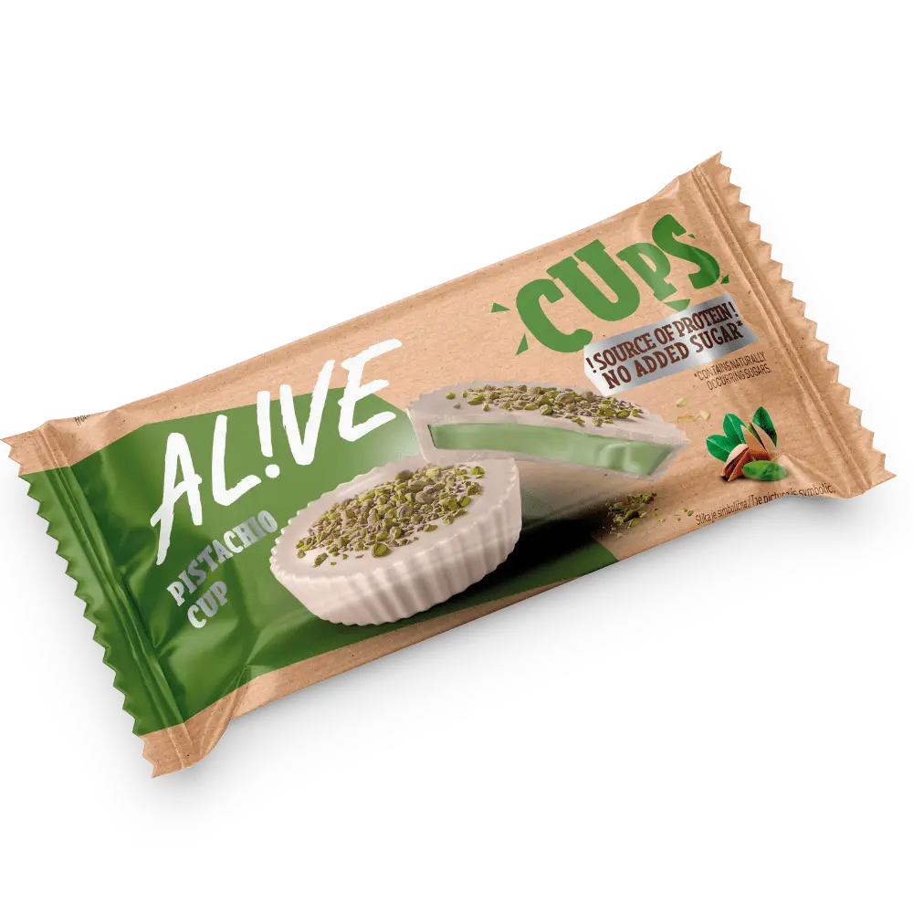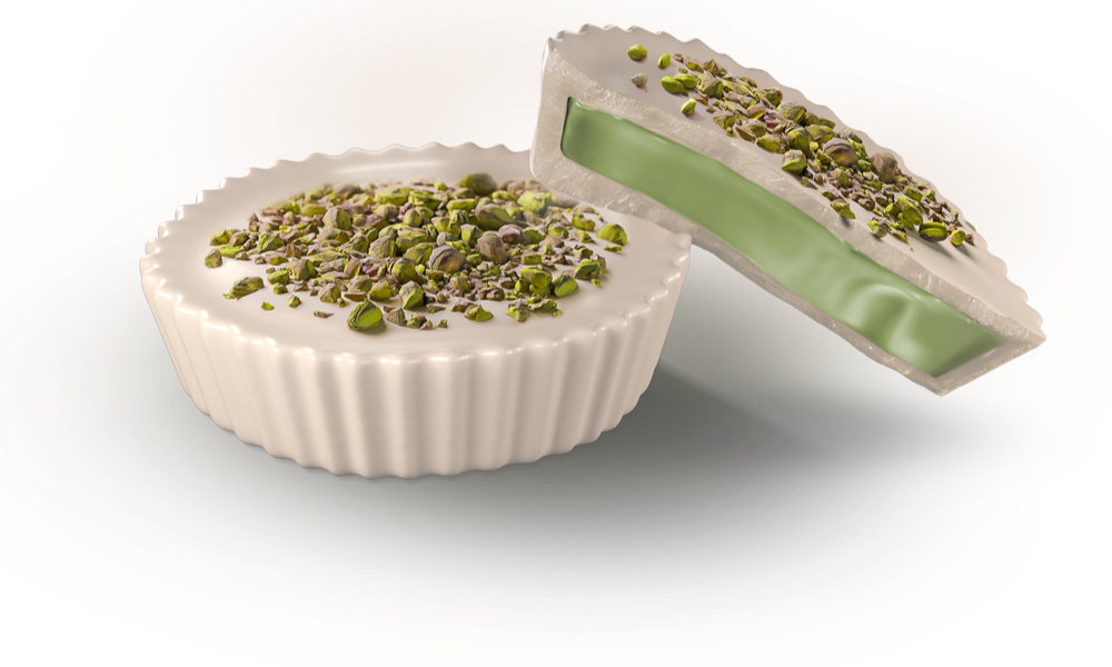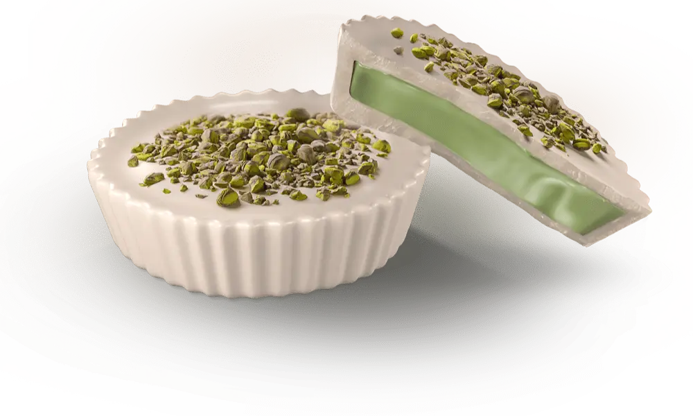 Proteinski cups z namazom pistacija in belim oblivom, ter posutimi pistacijami.