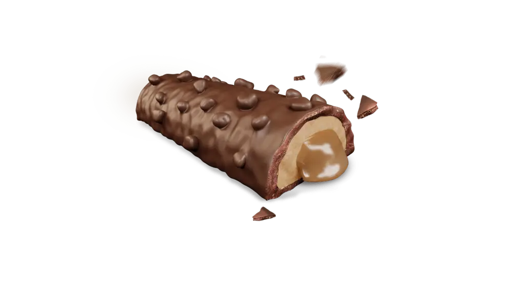 BELJAKOVINSKA REZINA Z OKUSOM KARAMELNIH BONBONOV (TOFFEE), Z BELJAKOVINAMI (34 %) IN SLADILI, OBLITA Z MLEČNO ČOKOLADNIM OBLIVOM (25 %) TER POSUTA S KAKAVOVIMI ZRNI (4,5 %). PRIPRAVLJENA ZA UŽIVANJE.